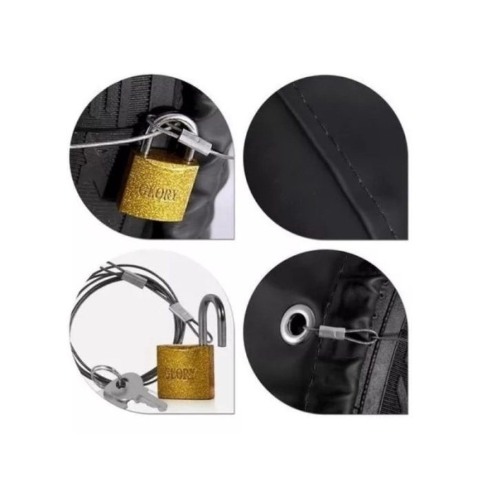 Vem com cabo de aço e cadeado com 2 chaves para proteção contra furto.